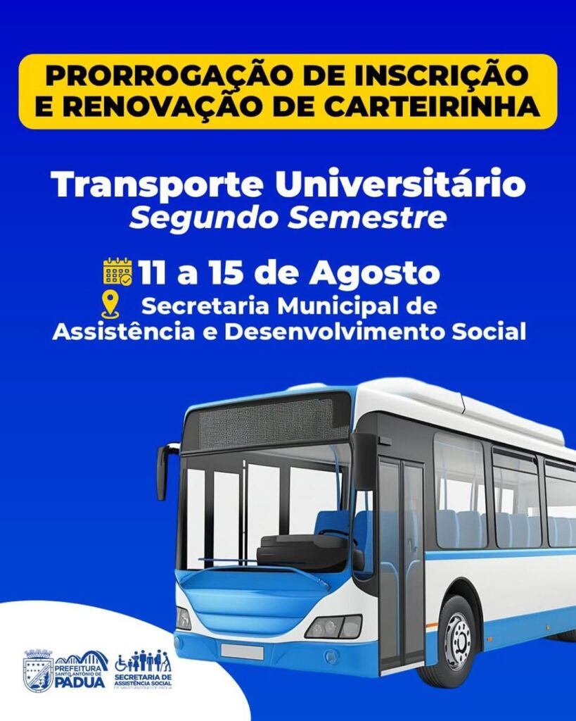 Santo Antônio de Pádua, RJ – A Secretaria Municipal de Assistência e Desenvolvimento Social de Pádua prorrogou o prazo para as inscrições e renovações do Transporte Universitário para o segundo semestre de 2025. Os estudantes universitários da cidade agora têm até a sexta-feira, 15 de agosto, para fazer a solicitação. Os interessados devem comparecer à […]
