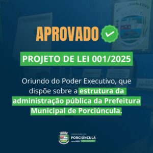 Na manhã de terça-feira, 07 de janeiro de 2025, durante sessão extraordinária, a Câmara Municipal de Porciúncula aprovou o Projeto de Lei 001/2025, oriundo do Poder Executivo.