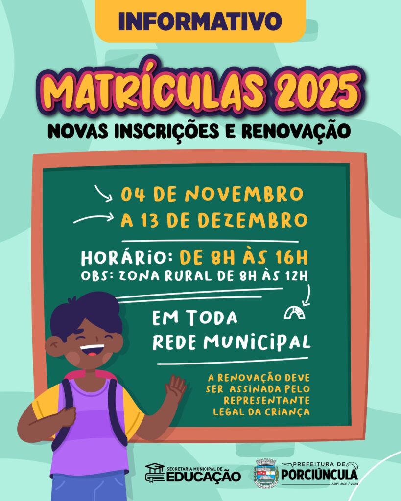 Matrículas 2025 abertas! Rede pública do município de Porciúncula RJ. Atenção, pais e responsáveis! As matrículas para 2025 já estão abertas para novas inscrições e renovação. 🗓️ Período: de 04 de novembro a 13 de dezembro ⏰ Horário: das 8h às 16h (nas escolas urbanas) | 8h às 12h (na zona rural) ✍️ A renovação […]