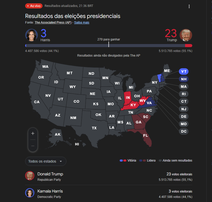 As urnas fecharam no “estado-chave” da Geórgia, enquanto Donald Trump e Kamala Harris conquistam suas primeiras vitórias; Trump foi projetado como vencedor em estados tradicionalmente republicanos, como Indiana e Kentucky; o reduto democrata de Vermont foi para Harris. O estado da democracia e a economia são as principais preocupações dos eleitores, segundo as primeiras pesquisas […]