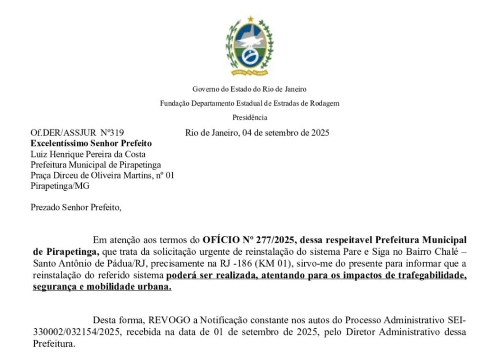 Santo Antônio de Pádua, RJ – Após a prefeitura de Pirapetinga enviar um ofício solicitando a reinstalação, o Departamento de Estradas de Rodagem do Rio