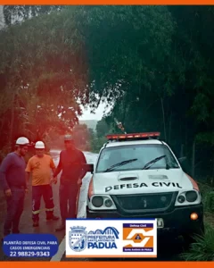 A Defesa Civil de Santo Antônio de Pádua atuou de forma imediata na tarde deste domingo para atender diversas ocorrências de quedas de árvores ao longo da RJ-186, após a forte instabilidade climática que atingiu a região.