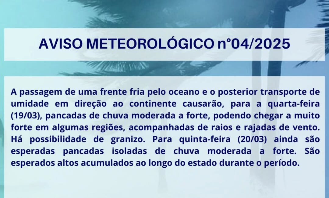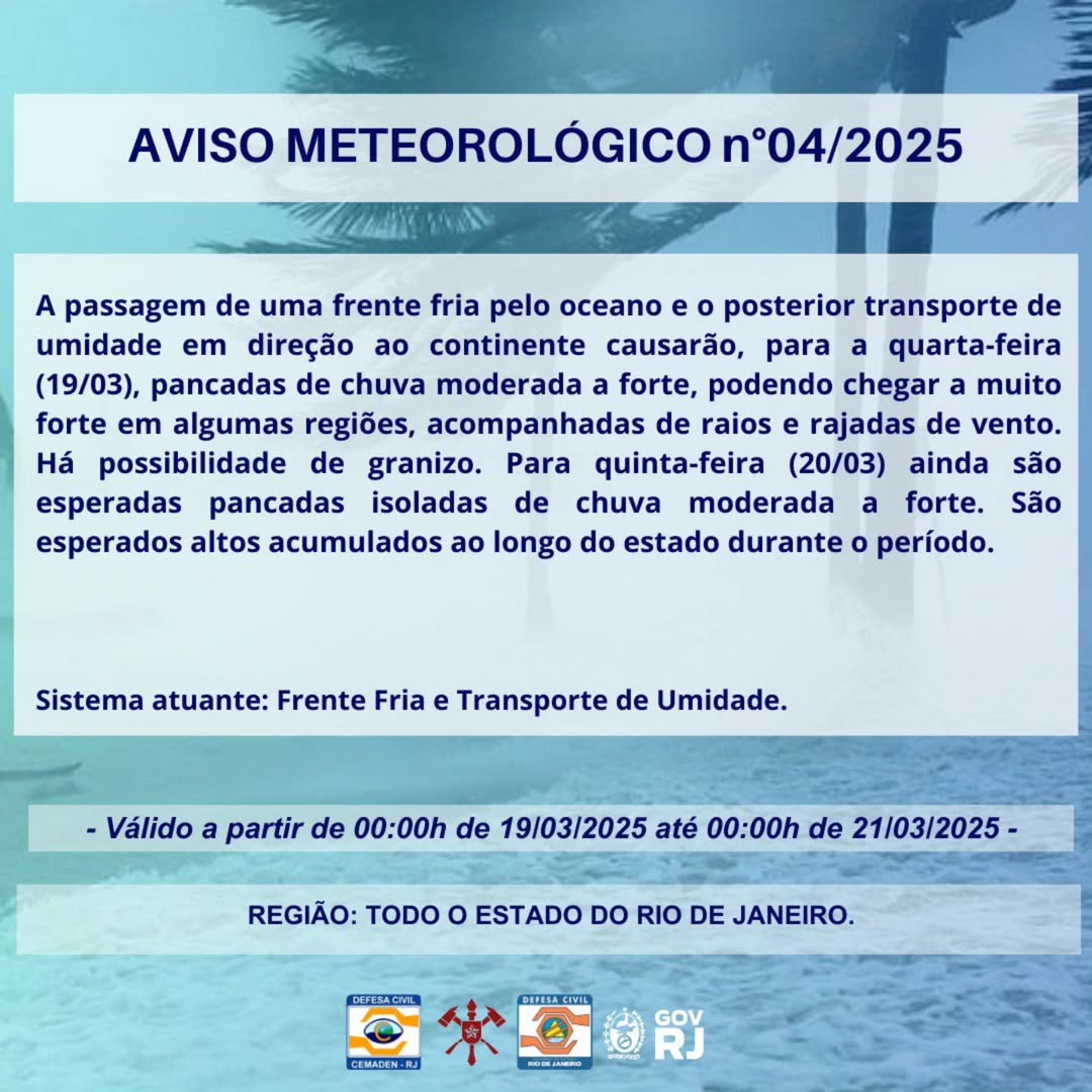 O Alerta Rio, sistema de previsão do tempo da Prefeitura do Rio, destaca que, durante o período da tarde, a chuva deve ser mais generalizada e de intensidade moderada a pontualmente muito forte. Existe a possibilidade de a chuva vir acompanhada de raios e ventos, que podem ser de intensidade forte.
