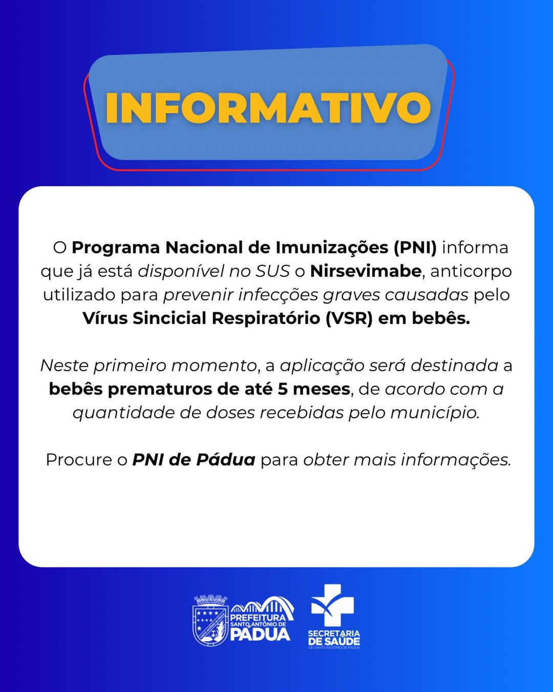 A Secretaria Municipal de Saúde de Santo Antônio de Pádua anunciou a chegada do Nirsevimabe à rede pública de saúde, um anticorpo monoclonal avançado voltado para a prevenção de infecções graves causadas pelo Vírus Sincicial Respiratório (VSR). O medicamento é uma ferramenta crucial para proteger crianças vulneráveis contra complicações respiratórias severas, como a bronquiolite e a pneumonia. Neste estágio inicial, seguindo a disponibilidade das doses recebidas, o município priorizará a aplicação em bebês prematuros de até 5 meses de idade.