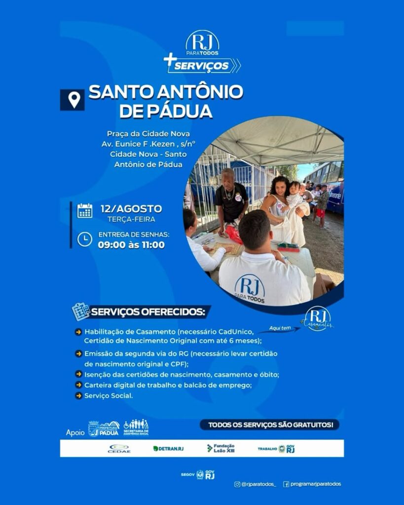 Santo Antônio de Pádua, RJ – A população de Santo Antônio de Pádua terá a oportunidade de acessar uma série de serviços gratuitos nesta terça-feira (12), com a chegada do programa estadual “RJ para Todos”. A ação acontecerá na Praça da Cidade Nova, com distribuição de senhas das 9h às 11h.