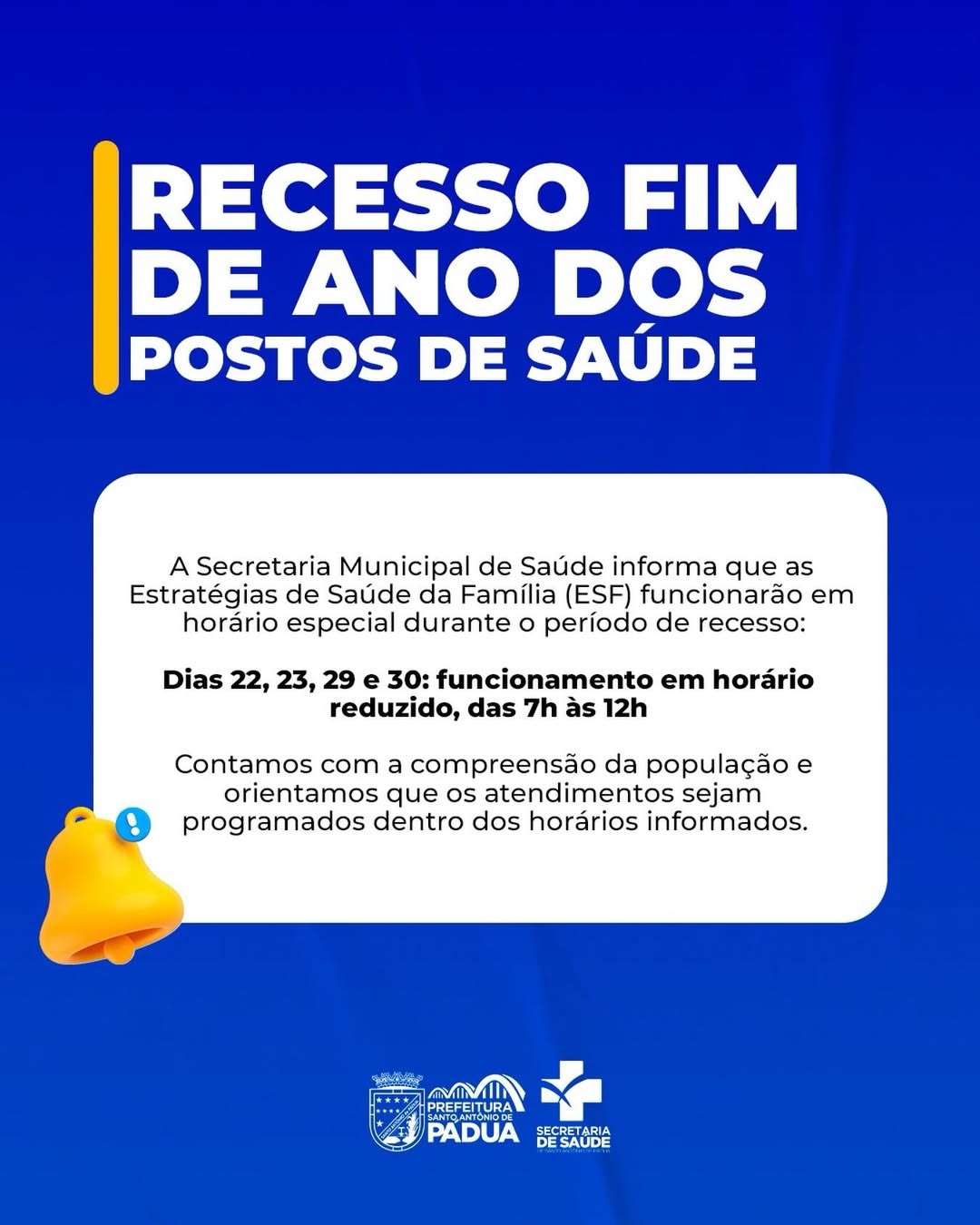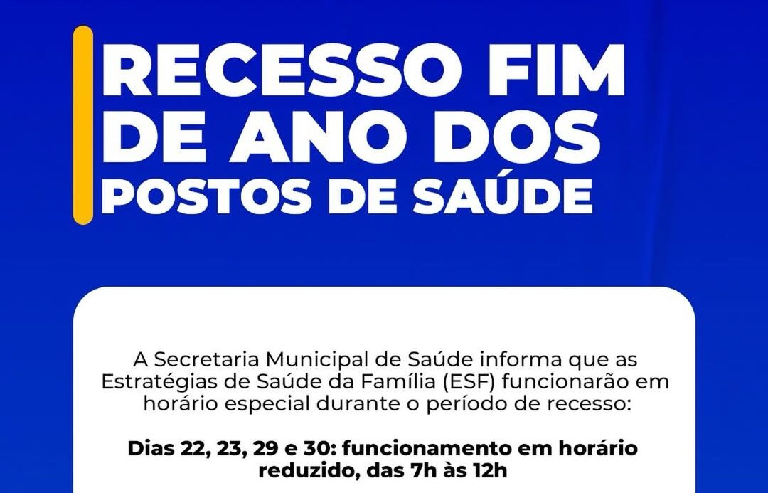 A Secretaria Municipal de Saúde de Santo Antônio de Pádua comunicou à população que as Estratégias de Saúde da Família (ESFs) funcionarão em horário especial por causa do recesso de fim de ano.
