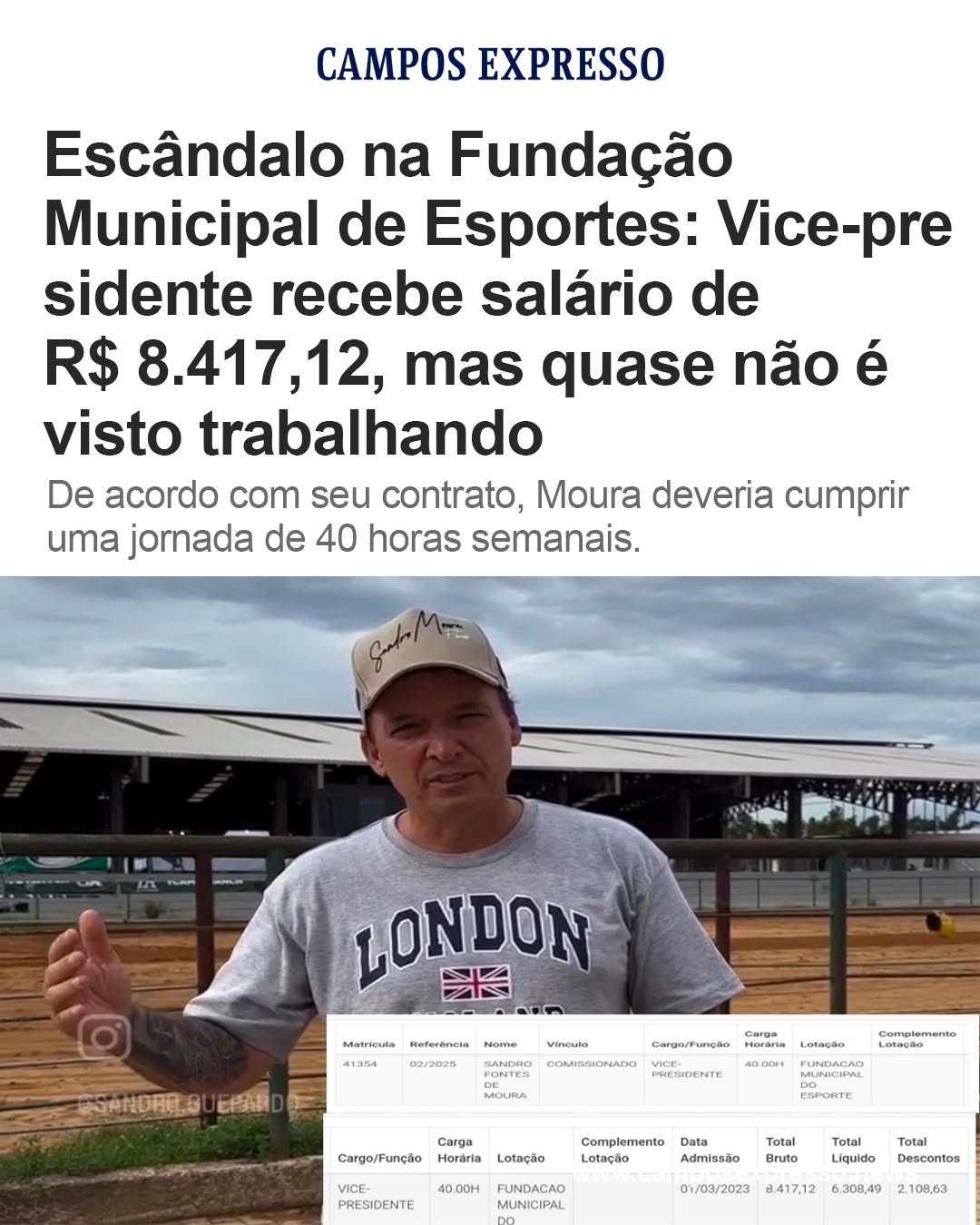 Enquanto Campos dos Goytacazes enfrenta a falta de investimentos no esporte, uma situação alarmante chama a atenção: o vice-presidente da Fundação Municipal de Esporte (FME), Sandro Fontes de Moura, nomeado em 1º de março de 2023 com um salário de R$ 8.417,12, raramente é visto cumprindo suas funções na instituição.